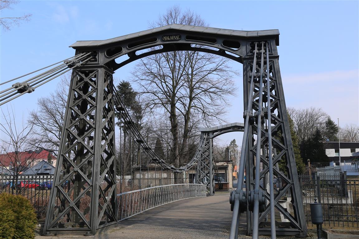Most został oddany do użytku w 1827, zaprojektował królewski inspektor hutniczy Carl Heinrich Schottelius. Konstrukcję wykonała miejscowa Huta Małapanew. Do budowy zużyto prawie 57 ton odlewów z żeliwa i ponad 14 ton stali. To czyni go najstarszym w Europie kontynentalnej żelaznym mostem wiszącym. O rok starszym jest funkcjonujący do tej pory żelazny most wiszący Menai, który wybudowany został w Anglii w 1826 roku, lecz zawieszony jest na kamiennych pylonach.