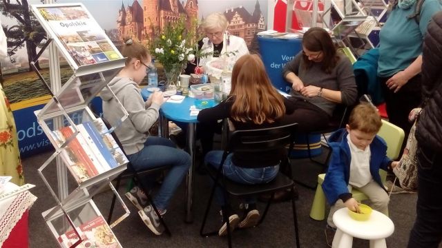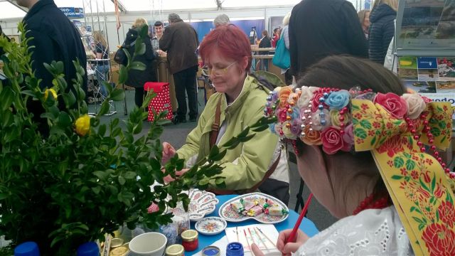 Na kilkunastu metrach kwadratowych stoiska wystawienniczego Opolszczyzna rozkwitała swoimi najpiękniejszymi barwami – ręcznie zdobiona porcelana oraz opolskie kroszonki tworzone na żywo przyciągały zwiedzających, zachwycających się kunsztem wykonania tradycyjnego rękodzieła.  Twórczynie ludowe – Agnieszka Okos Irena Zawadzka, obie w barwnych strojach ludowych, zachęcały zwiedzających do udziału w warsztatach tradycyjnego zdobienia porcelany oraz jaj wielkanocnych.