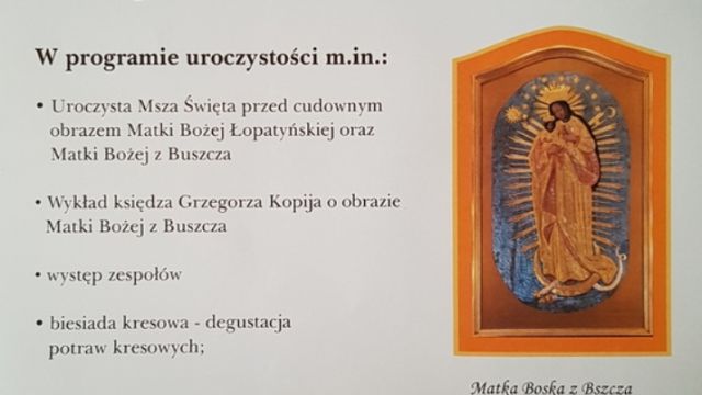 Uroczystości rozpoczęła uroczysta msza święta. Po niej parafianie i przybyli goście mogli wysłuchać wykładu ks. Grzegorza Kopija o historii obrazu Matki Boskiej Buszczeckiej (z miejscowości Buszcze, powiat brzeżański, woj. tarnopolskie II RP). Obraz ten po II wojnie światowej Kresowianie przywieźli do Racławic Śląskich, gdzie obecnie znajduje się w miejscowym kościele parafialnym pw. Wniebowzięcia Najświętszej Maryi Panny.