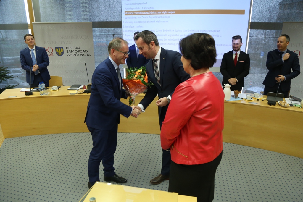 Przedtem jednak przewodniczący sejmiku Rafał Bartek w imieniu radnych województwa pogratulował wicemarszałkowi Romanowi Kolkowi, który kilka dni wcześniej otrzymał z rąk ministra zdrowia nagrodę w konkursie Sukces Roku 2018 w ochronie zdrowia w kategorii „zdrowie publiczne”.