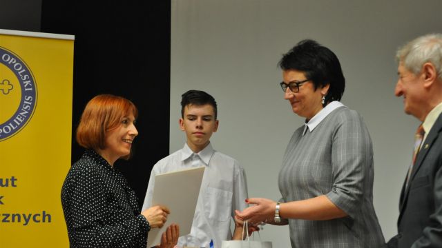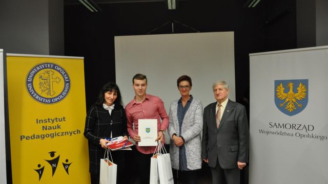Zwycięzcy tegorocznej edycji konkursu otrzymali dyplomy Marszałka Województwa Opolskiego oraz cenne nagrody rzeczowe z rąk Agnieszki Okupniak, dyrektorki Departamentu Współpracy z Zagranicą i Promocji Regionu oraz Moniki Jurek, dyrektorki Departamentu Edukacji i Rynku Pracy Urzędu Marszałkowskiego Województwa Opolskiego. Spotkanie prowadził profesor zw. dr hab. Zenon Jasiński.