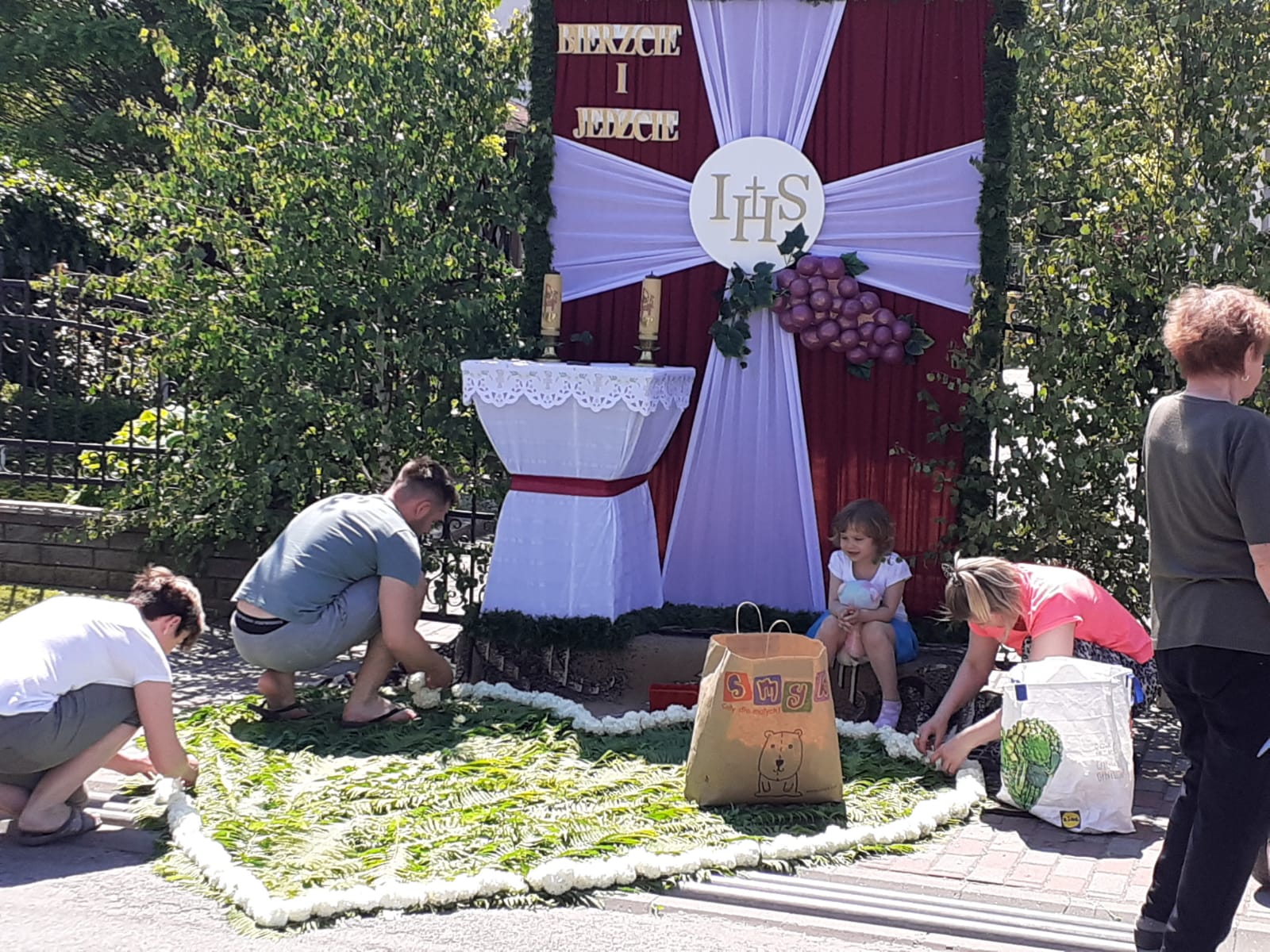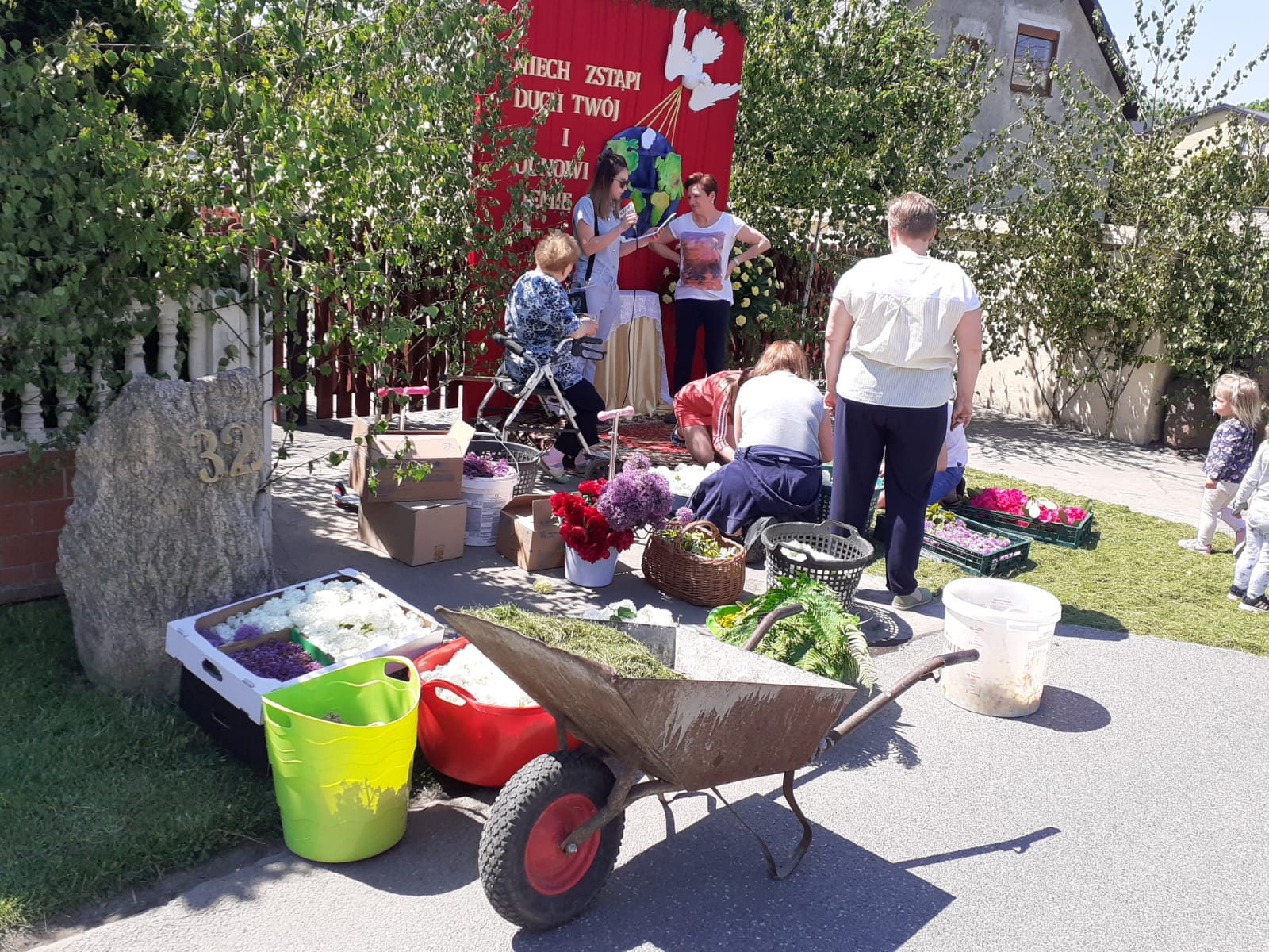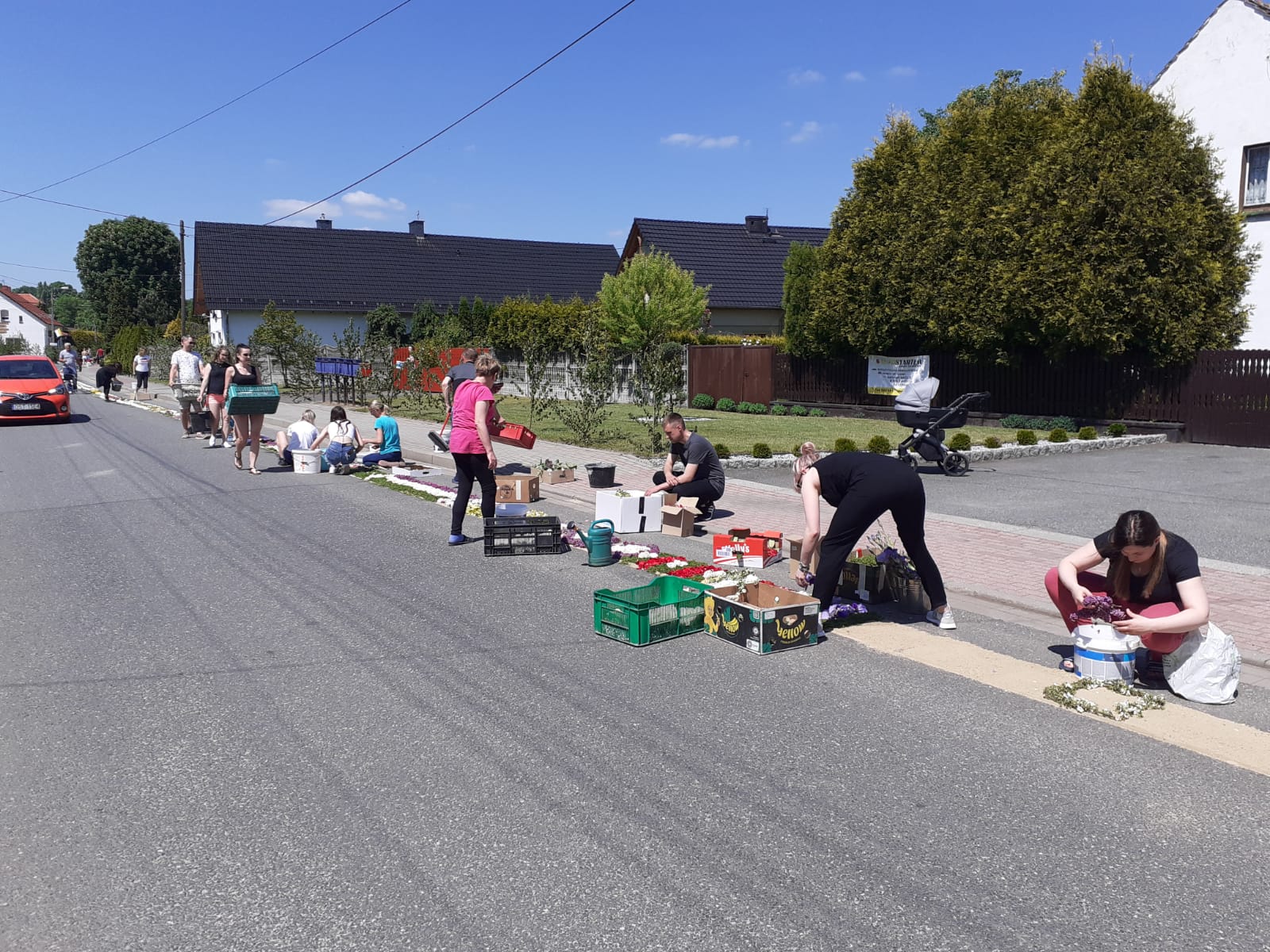 W tegorocznych przygotowaniach do tradycyjnego układania dywanów kwietnych w Olszowej uczestniczyli m.in. wicemarszałek Zuzanna Donath-Kasiura oraz dyrektor Departamentu Współpracy z Zagranicą i Promocji Regionu UMWO Agnieszka Okupniak, w towarzystwie burmistrza Huberta Ibroma i twórczyni ludowej z Olszowej Teresy Soboty.