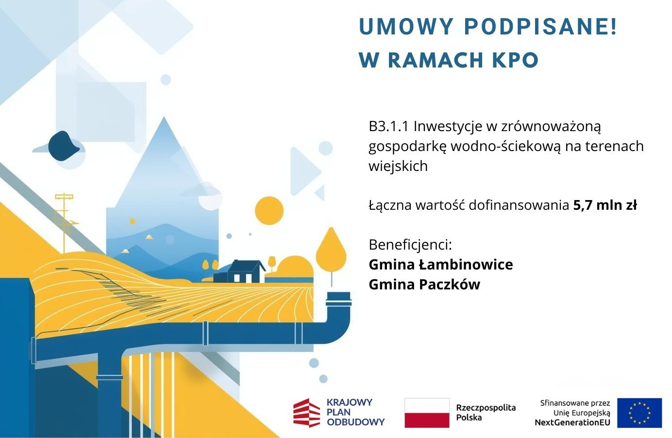 Kolejne gminy – tym razem Gminy Łambinowice i Paczków – otrzymają dofinansowanie z Krajowego Planu Odbudowy na rozbudowę infrastruktury wodno-kanalizacyjnej. Zawarcie umów, które właśnie zostały podpisane, było możliwe dzięki dodatkowym środkom przyznanym przez Ministerstwo Rolnictwa i Rozwoju Wsi.